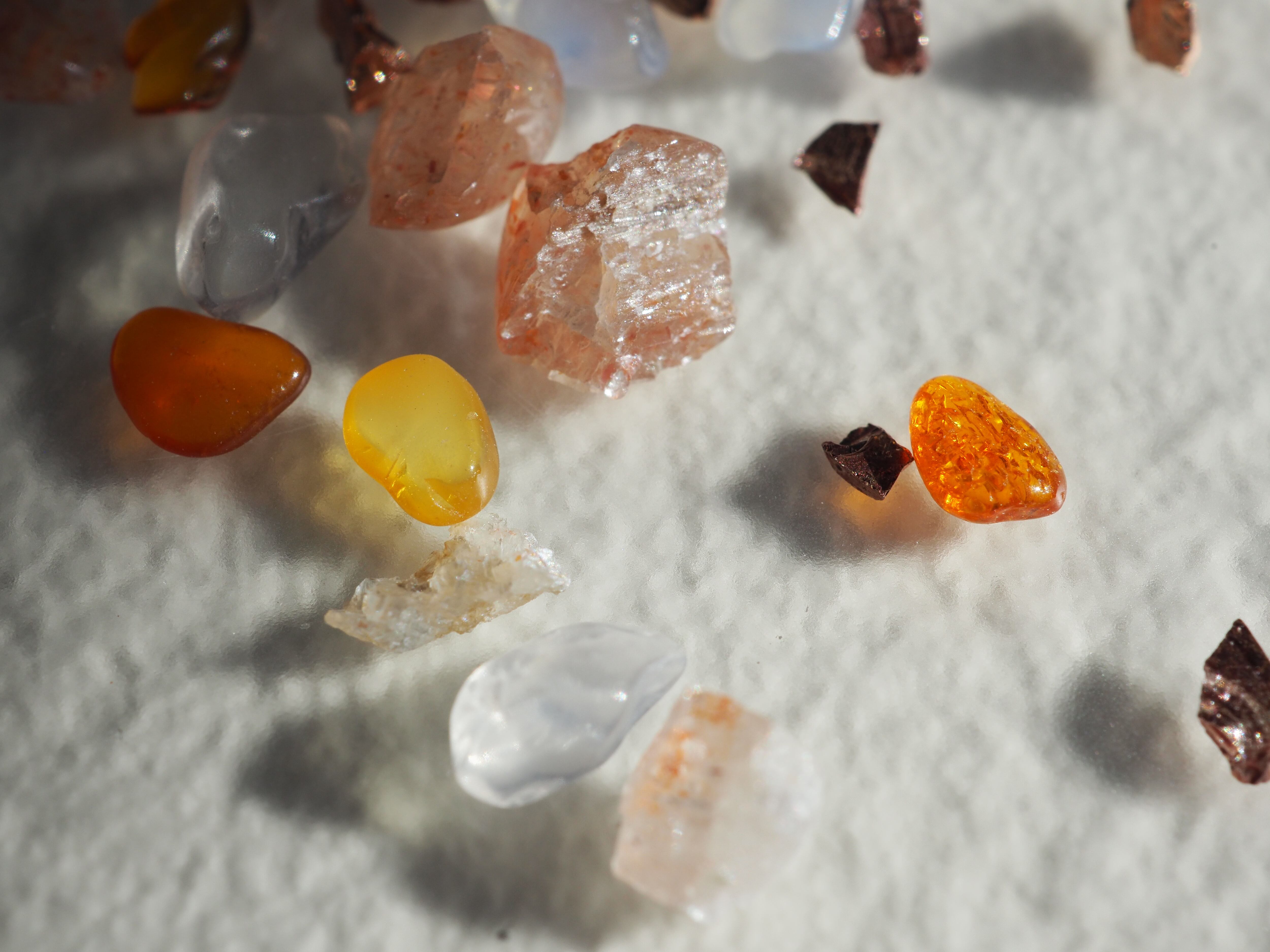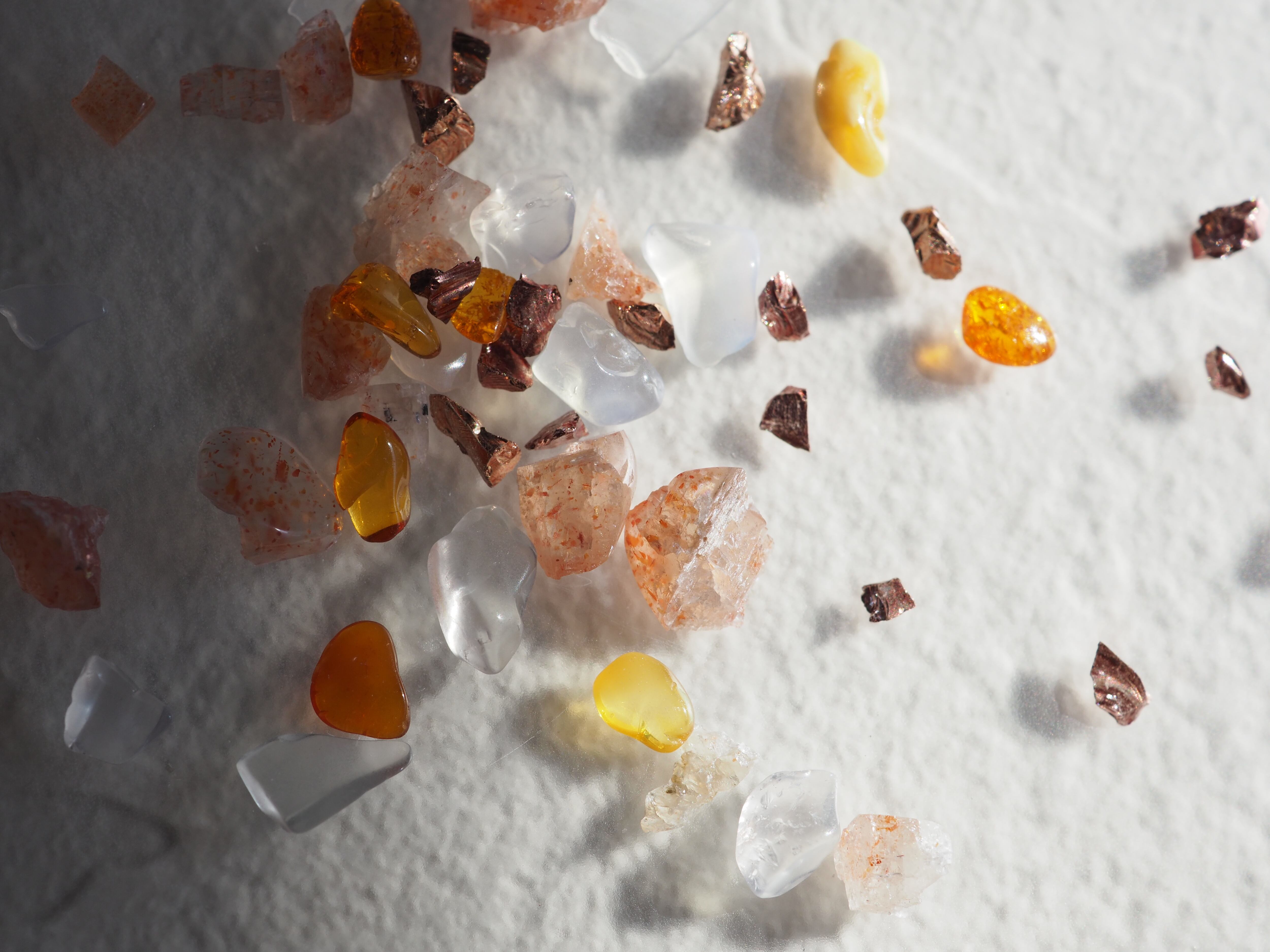 サンストーン、アンバー、メタリックローズゴールドクラッシュ、ミックスデコレーションパーツです。