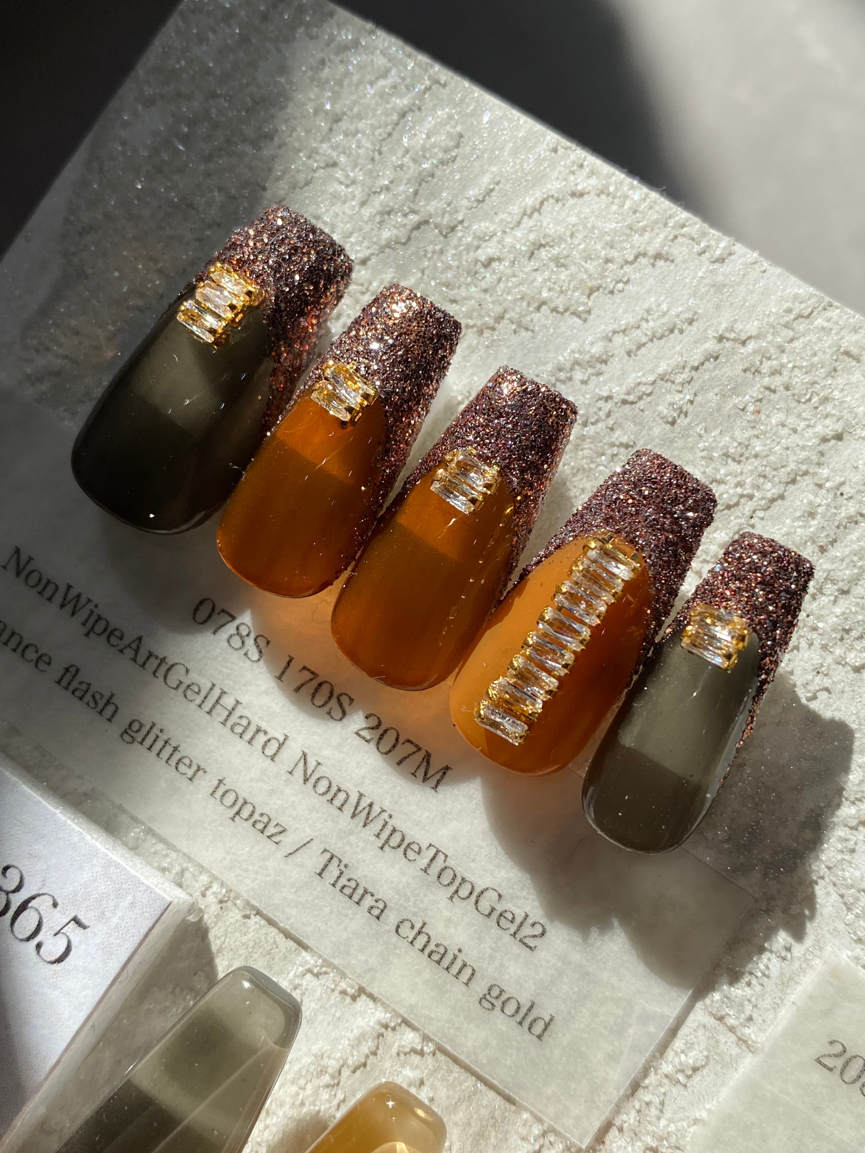 仕上げの際はビジューを留めている金具部分とビジューの隙間にもトップジェルを塗布してください。